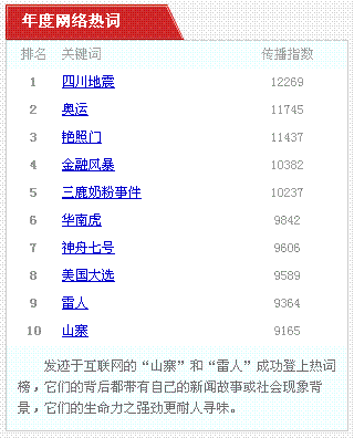 年度網絡熱詞排行榜中,“四川地震”、“奧運”和“艷照門”成為2008年網友最關注的三大事件,分列該榜單前三甲。而發(fā)跡于互聯(lián)網的“山寨”和“雷”也成功入選年度十大網絡熱詞,與以往網絡流行詞所不同,它們的背后都帶有自己的新聞故事或社會現(xiàn)象背景,生命力之強勁更耐人尋味。