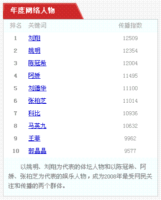 受到北京舉辦奧運會的影響和“艷照門”事件的炒作,以姚明、劉翔為代表的體壇人物和以陳冠希、阿嬌、張柏芝為代表的娛樂人物,成為最受關注和傳播的兩類公眾人物??票?、貝克漢姆和菲爾普斯為十份榜單中僅有的三名外籍人士,科比還同時入選年度網絡人物和年度體壇人物的十強。在年度企業(yè)家榜單中,以王石、黃光裕、牛根生等為代表的爭議性人物和以丁磊、馬云為代表的商業(yè)模式英雄,成為最受關注和傳播的兩類企業(yè)家。